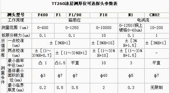 時代TT260FN涂層測厚儀的探頭測量技術參數(shù):